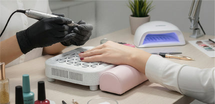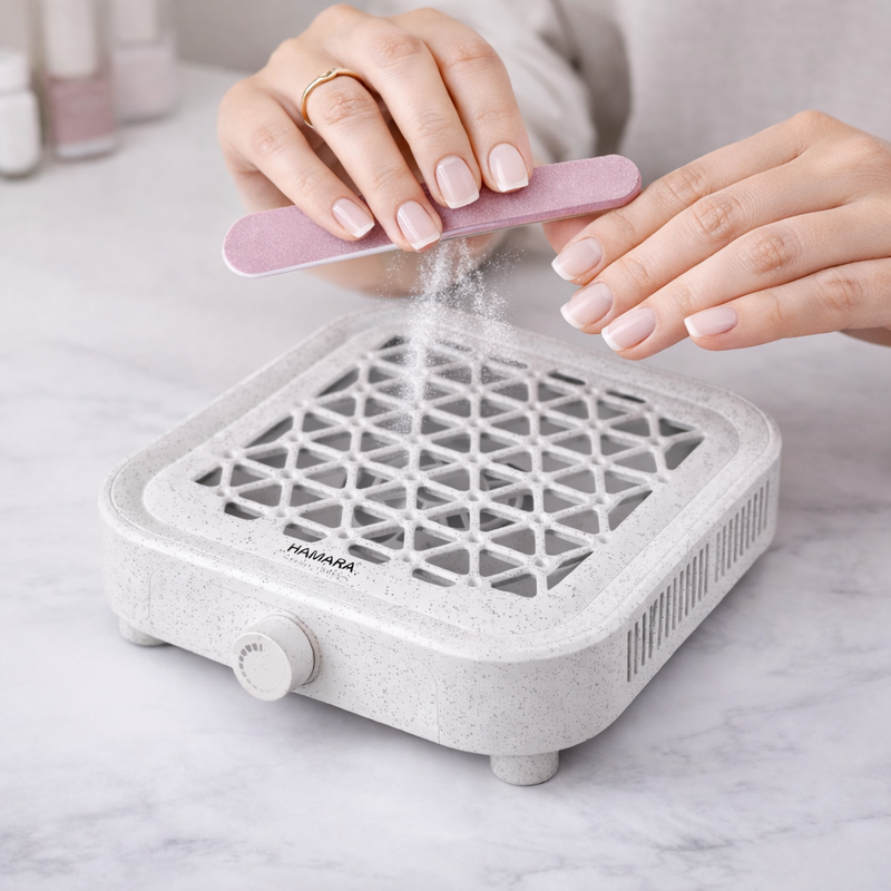 The HAMARA Nail Dust Collector is powered by a high speed 8000 RPM brushless motor that efficiently captures fine nail dust during filing and manicure sessions. It includes an adjustable suction dial for better control, a magnetic top cover for quick filter access, and a reusable filter that can be easily cleaned. The anti slip base keeps the device stable during use, while the compact and lightweight design makes it convenient for both salon professionals and home nail setups.